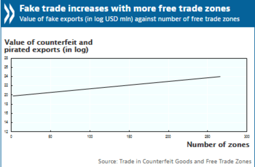 The OECD reportTrade in Counterfeit Goods and Free Trade Zones, concluded that “exports of counterfeit and pirated goods from a country or economy rise in parallel with the number and size of free trade zones it hosts. Comparing growth in free trade zones, measured by the number of firms and employees in the zone, and customs seizure data from around the world shows that establishing a new free trade zone is associated with a 5.9% rise in the value of counterfeit exports from the host economy.”