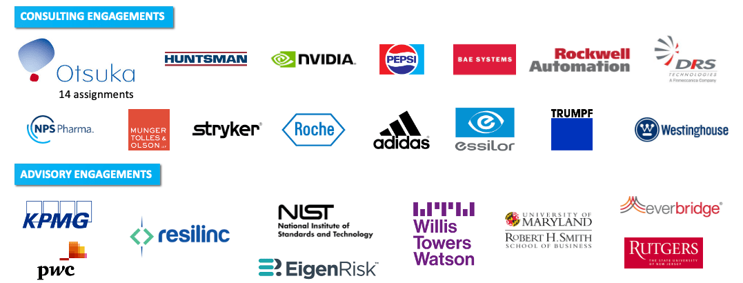 We provide strategic advisory and market facing services to leading solution providers such as PwC, KPMG, Willis Towers Watson, Resilinc, Everbridge, EigenRisk, and several risk management SaaS providers.